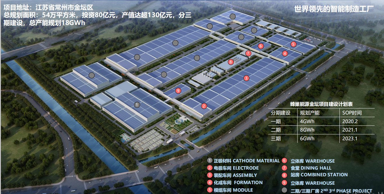 先来简单领会下这座工场:蜂巢能源位于金坛的工场建建面积 54 万平方米,正在2020年3月完成材料系统的进一步优化,随后将进行三期 6 GWh 产能的扶植?